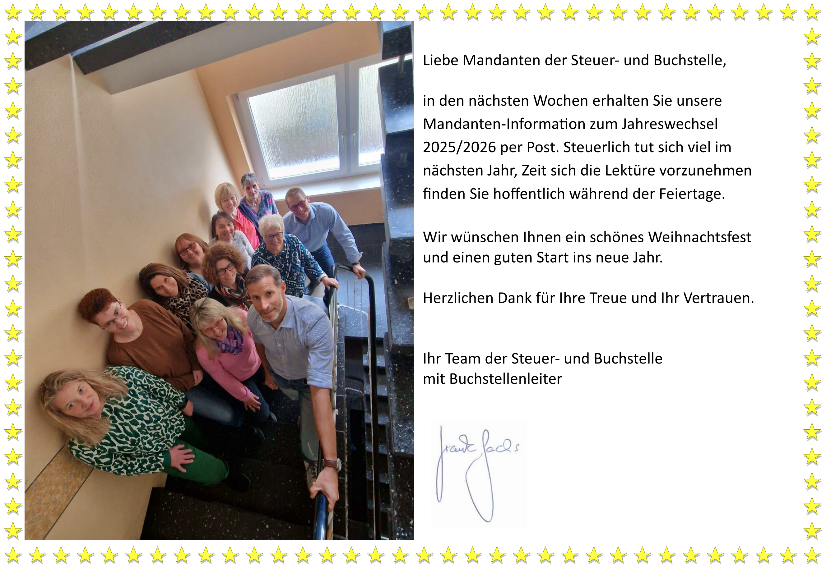 Mandanten der Steuer- und Buchstelle können Ihre Unterlagen in der Zeit vom 05.-07.01.2026 bei Herrn Fiedler von der Kfz-Innung Hanau-Schlüchtern abgeben (im 2. Stock der Kreishandwerkerschaft in Gelnhausen). AU-Plaketten können in dieser Zeit bei Herrn Schilling in Schlüchtern bestellt werden. Tel.: 06661 9613-11 / schilling@kh-gelnhausen.de