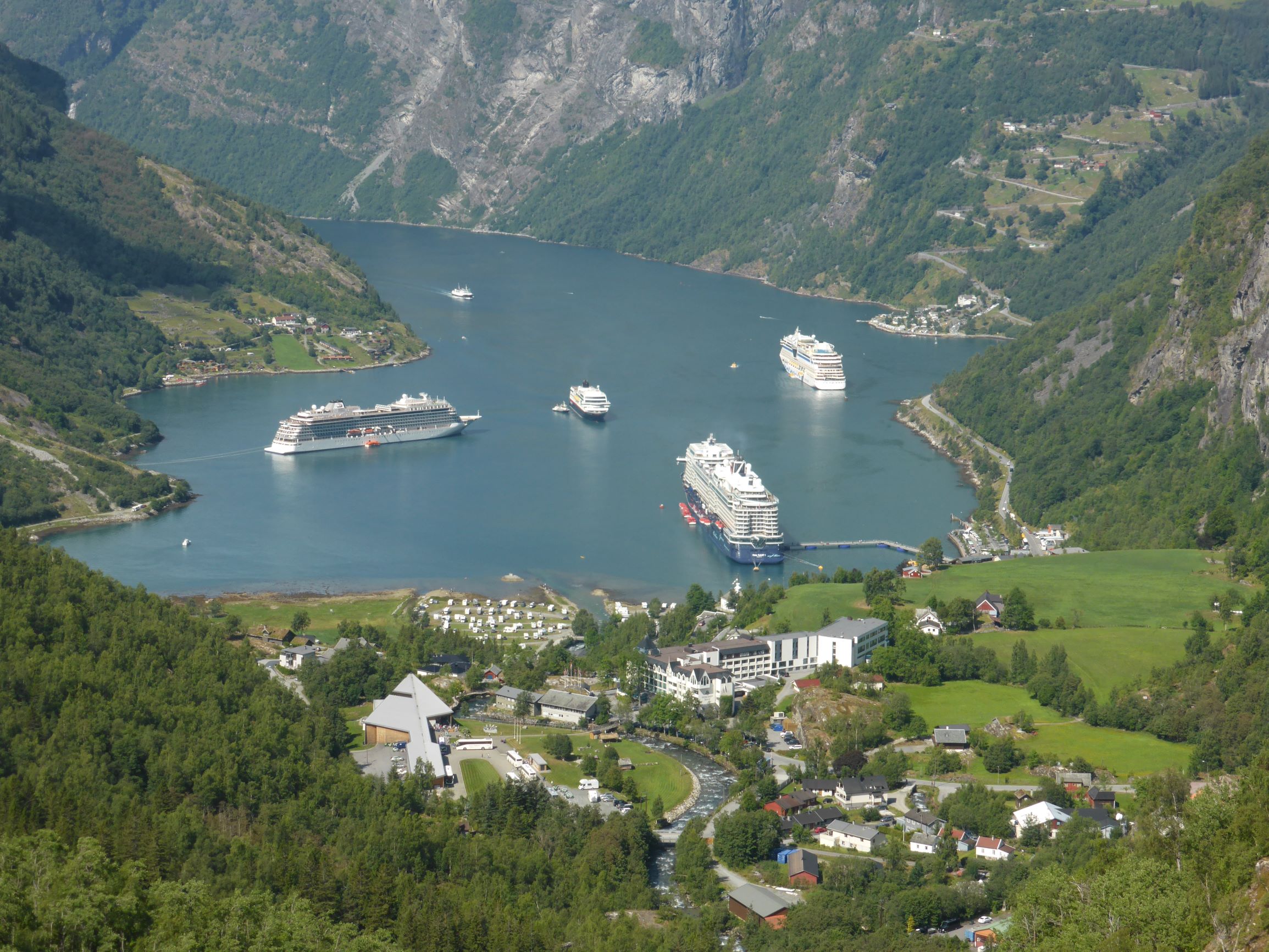 Ein weiteres Ziel auf der Reise war der Geirangerfjord. Hier ging es mit dem Bus durch das grüne Flydal über 20 Haarnadelkurven zunächst zum Aussichtspunkt Flydalsjuvet. Flydalsjuvet eröffnet einen imposanten Anblick und ist ein guter Standort für Fotos von Geiranger und dem Geirangerfjord mit den vielen Kreuzfahrtschiffen. Von hier kommt eines der am meisten benutzten Motive der norwegischen Touristenwerbung.