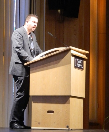 Für die Stadt Gelnhausen gratulierte Stadtverordnetenvorsteherin Pia Horst und appellierte an die Gesellen, in ihren Ausbildungsbemühungen nicht nachzulassen und sich stets Mühe zu geben. Karsten Günder, Leiter der Kinzig-Schule Schlüchtern, beglückwünschte die Gesellen, sie hätten sich den Erfolg im Schweiße ihres Angesichts erarbeitet. „Bleiben Sie kreativ und innovativ“, forderte er. Nach der Rede behielten Moderator Johannes Zenglein und Ottmar Hutzenlaub den überraschten Karsten Günder noch auf der Bühne um ihm zur Geburt seiner Zwillinge zu gratulieren und Präsente für beide zu überreichen.