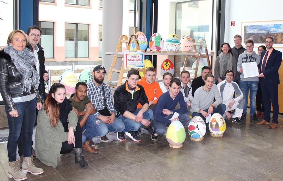 Zunächst fertigten die Auszubildenden des Stuckateurhandwerks in der Kinzigschule in Schlüchtern die großen Stuck-Eier an. Die Auszubildenden der Maler und Lackierer verzierten sie dann unter Anleitung ihrer Fachlehrer nach eigenem künstlerischem Ermessen zum Thema „Vorbilder und Persönlichkeiten“.