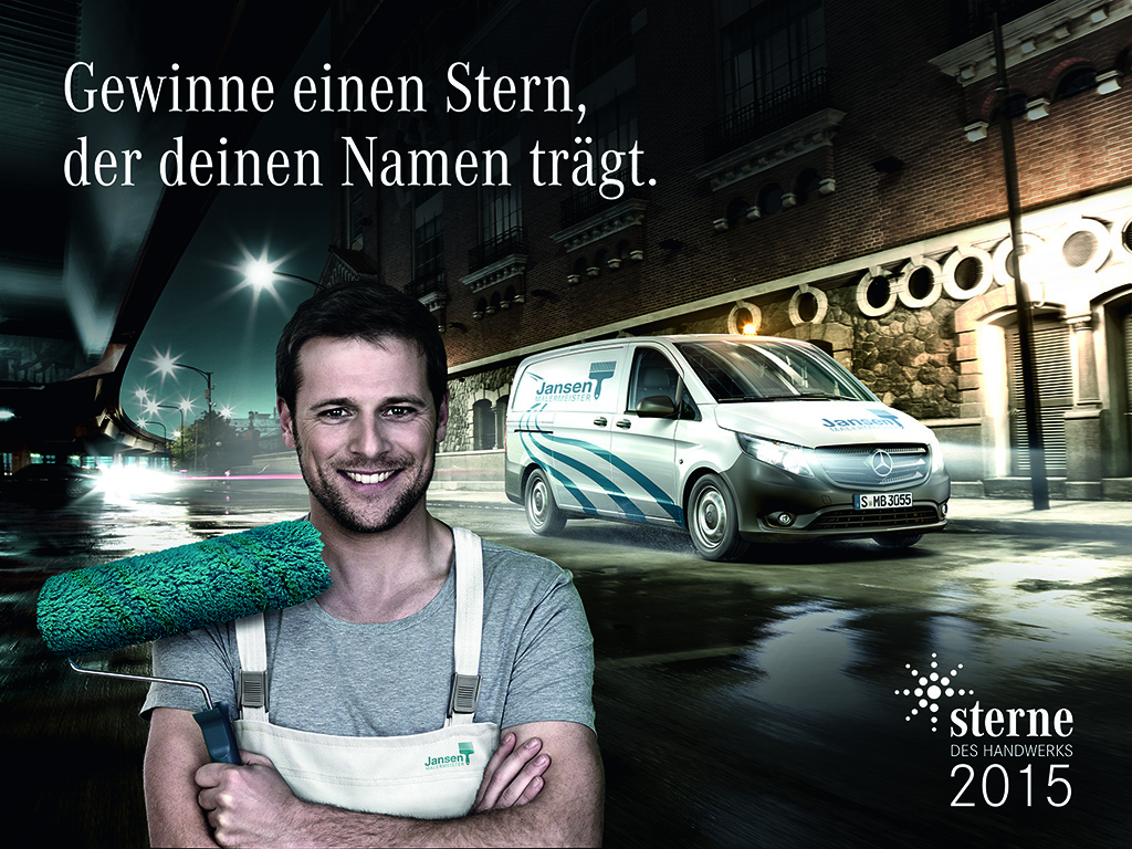Bei den „Sternen des Handwerks“ konkurrieren Handwerksfahrzeuge miteinander um die kreativste Gestaltung. Bis zum 12. Januar 2015 werden unter Schirmherrschaft der Aktion Modernes Handwerk e. V. und mit der Unterstützung des Mercedes-Benz Deutschland Vertrieb Transporter und Vans die besten Fahrzeugbeschriftungen eingetragener Handwerksbetriebe gesucht. Diese können sich mit Fotos ihres teil- oder vollverklebten Firmenwagens auf http://www.sterne-des-handwerks.de bewerben.